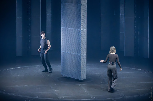 Noch geschwind eine weitere Erklärung, diesmal aber für Ihr Verständnis der folgenden Bilder, falls sie die oben verlinkte Besetzungsliste nicht angeschaut und keine Rezensionen gelesen haben sollten: Der Nathan wird von der umwerfenden Valery Tscheplanowa verkörpert. Wobei ich dieses Wort "verkörpert" mit Bedacht wähle, denn die Spannung und Ausdrucksfähigkeit ihres Körpers haben mich rasch vergessen lassen, dass hier kein alter Mann agiert, sondern eine junge Frau. Geschlecht und Alter waren für mich im Nu irrelevant.